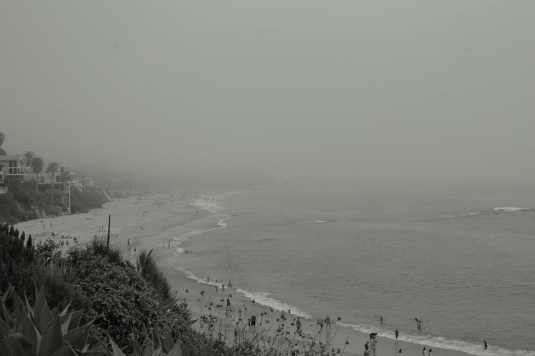 Keywords: grey sky beach sand waves houses water trees people swimming