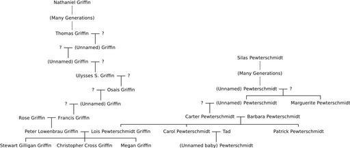 Keywords: Griffin family tree.svg The current Griffin family tree Note The means that the person is currently unknown Aside from Nathaniel Griffin some Irish Griffins should be included at the start of the tree That is why Peter Griffin's dad is Irish DarkEvil based on File Griffin Family Tree 2 jpeg which is free 2006-12-01 DarkEvil I believe the first Griffin recorded should be Moses Griffin who came to fruition in season five However a flashback shows a pre-historic Griffin family in which the patriarch successfully markets his new invention - the wheel - using his wife's sex appeal This would in effect predate Moses Griffin DEFAULTSORT Griffin family tree Family Guy Family trees in fiction |