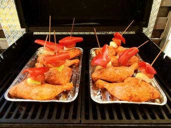 Keywords: grill barbecue delicious meat paprika tomato onion food eat dine chicken chicken drumsticks