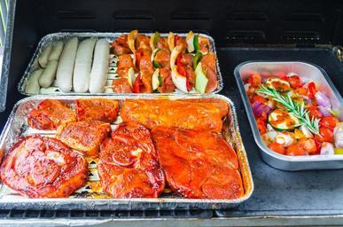 Keywords: grilled meats steak sausage meat beef food grill fire barbecue green asparagus flame celebration charcoal summer party garden bavaria grilled juicy asparagus