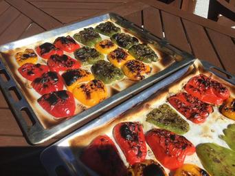 Keywords: grilled peppers food vegetables red green yellow