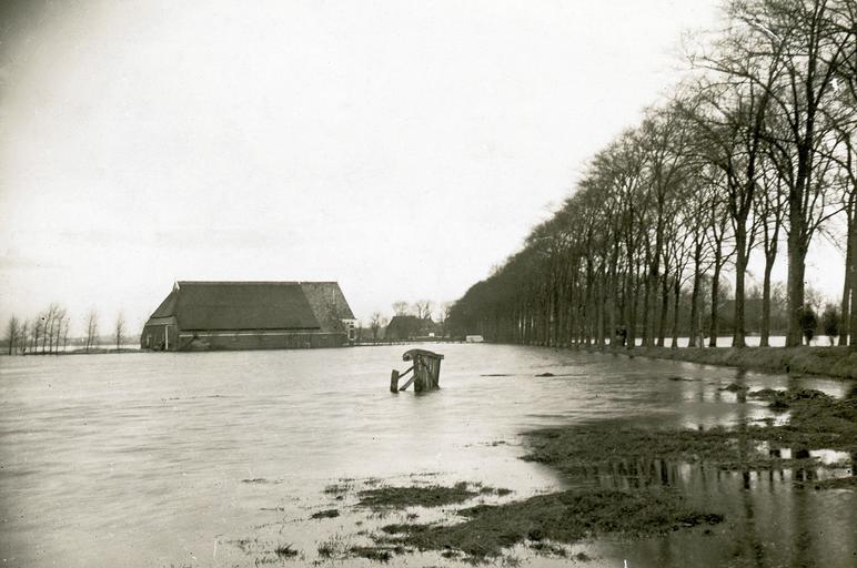 Keywords: Gisterennacht is de Onlandse Dijk om den polder „De Verbetering" aan den Paterswoldseweg nabij Groningen doorgebroken. Het door den krachtigen Westenwind opgestuwde water heeft een gat van 30 a 40 Meter in den dijk geslagen en wast nog steeds, zoodat het reeds op eene plaats over den weg stroomt en de vrees gewettigd isdat de tramdienst Groningen-Paterswolde zal moeten worden geschorst. Het overstroomde land grenst haast aan het in wording zijnde Stadspark. Er is reeds veel schade en nog grooter ongerief. Met het herstel van den dijk is een begin gemaakt.