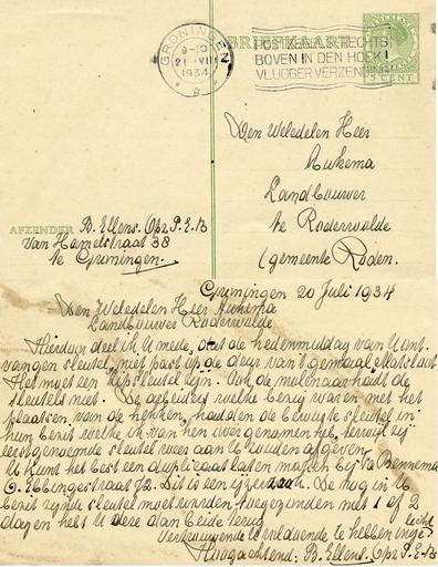 Keywords: Schrijven aan dhr. Aukema landbouwer te Roderwolde Inhoud schrijven: Hierdoor deel ik U mede, dat de hedenmiddag van U ontvangen sleutel niet past op de deur van't gemaal Matsloot. Het moet een Lipsleutel zijn. Ook de molenaar heeft de sleutels niet. De arbeiders welke bezig waren met het plaatsen van de hekken, hadden de bewuste sleutel in hun bezit welke ik van hen over genomen heb, terwijl zij eerstgenoemde sleutel weer aan U zouden afgeven. U kunt het best een duplicaat laten maken bij Fa. Bennema, Oude Ebbingestraat 72. Dit is een ijzerzaak. De nog in U bezit zijnde sleutel moet worden toegezonden met 1 of 2 dagen hebt u deze dan beide terug. Schrijven aan dhr. Aukema landbouwer te Roderwolde Inhoud schrijven: Hierdoor deel ik U mede, dat de hedenmiddag van U ontvangen sleutel niet past op de deur van't gemaal Matsloot. Het moet een Lipsleutel zijn. Ook de molenaar heeft de sleutels niet. De arbeiders welke bezig waren met het plaatsen van de hekken, hadden de bewuste sleutel in hun bezit welke ik van hen over genomen heb, terwijl zij eerstgenoemde sleutel weer aan U zouden afgeven. U kunt het best een duplicaat laten maken bij Fa. Bennema, Oude Ebbingestraat 72. Dit is een ijzerzaak. De nog in U bezit zijnde sleutel moet worden toegezonden met 1 of 2 dagen hebt u deze dan beide terug. |
