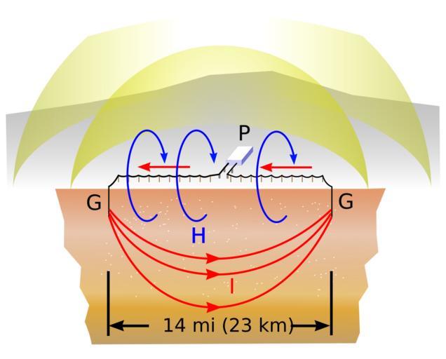 Keywords: Ground dipole ELF antenna.svg ground dipole antenna used to transmit extremely low frequency ELF radio waves showing how it works This is modeled on the U S Navy ELF radio transmitter at Clam Lake Wisconsin which was used to communicate with submerged submarines at a frequency of 76 Hz from 1989 to 2004 The antenna consists of two electrodes buried in the Earth G 14 miles 23 5 km apart linked by overhead transmission lines resembling ordinary power distribution lines to a power plant transmitter P The system functions as a giant vertical loop antenna in which the earth serves as part of the loop The power plant drives the antenna with 300 amperes alternating current at 76 Hz which flows through one transmission line in looping currents I deep in bedrock from one ground electrode to the other and back through the other transmission line the drawing shows only one direction of the alternating current The AC current creates an alternating magnetic field H which radiates ELF waves yellow The radiation pattern is directional with two lobes maxima off the ends of the wire This drawing was made with information from cite journal Jones David Llanwyn Sending signals to submarines New Scientist 26 1463 37-41 Holborn Publishing Group London 1985-07-04 http //books google com/books id NOPpwVvNu44C pg PA39 dq ELF+transmitter hl en sa X ei dhI4T8KrIbLZiQKCg8yqCg ved 0CFYQ6AEwBA v onepage q sanguine f false February 17 2012 among other sources 2012-02-29 own Chetvorno cc-zero Uploaded with UploadWizard Antenna diagrams Alternating current |