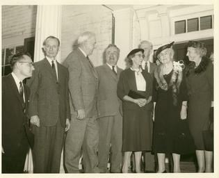 Keywords: monochrome Left to right: Dr. Spencer, T. Walton Opie, Governor Almond, Mr. Phipps, Mrs. Handy, Dr. Handy, Mrs. W Wilson, Mrs. McK Smith Date: 1959. Left to right: Dr. Spencer, T. Walton Opie, Governor Almond, Mr. Phipps, Mrs. Handy, Dr. Handy, Mrs. W Wilson, Mrs. McK Smith Date: 1959. |