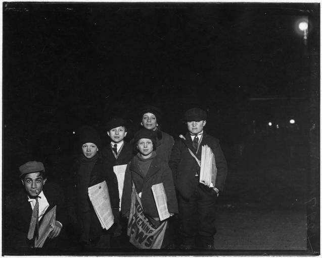 | Keywords: nara:arcid=523275 u.s. national archives usnationalarchives lewis hine lewishine child labor childlabor working conditions workingconditions factory national child labor committee nationalchildlaborcommittee 1910 blackandwhite groupshot people monochrome photo border black and white Original Caption: Group on Court St. selling around the Shea Theatre, 8 P.M. Boy in center, Vito Bucheto, 10 years old. Behind him to left, Tony Gregoria, 12 years old. Buffalo, N.Y, February 1910 U.S. National Archives’ Local Identifier: 102-LH-1217 Photographer: Hine, Lewis Subjects: Child Labor National Child Labor Committee Working Conditions Factory Persistent URL: research.archives.gov/description/523275 Repository: Still Picture Records Section, Special Media Archives Services Division (NWCS-S), National Archives at College Park, 8601 Adelphi Road, College Park, MD, 20740-6001. For information about ordering reproductions of photographs held by the Still Picture Unit, visit: www.archives.gov/research/order/still-pictures.html Reproductions may be ordered via an independent vendor. NARA maintains a list of vendors at www.archives.gov/research/order/vendors-photos-maps-dc.html Access Restrictions: Unrestricted Use Restrictions: Unrestricted Original Caption: Group on Court St. selling around the Shea Theatre, 8 P.M. Boy in center, Vito Bucheto, 10 years old. Behind him to left, Tony Gregoria, 12 years old. Buffalo, N.Y, February 1910 U.S. National Archives’ Local Identifier: 102-LH-1217 Photographer: Hine, Lewis Subjects: Child Labor National Child Labor Committee Working Conditions Factory Persistent URL: research.archives.gov/description/523275 Repository: Still Picture Records Section, Special Media Archives Services Division (NWCS-S), National Archives at College Park, 8601 Adelphi Road, College Park, MD, 20740-6001. For information about ordering reproductions of photographs held by the Still Picture Unit, visit: www.archives.gov/research/order/still-pictures.html Reproductions may be ordered via an independent vendor. NARA maintains a list of vendors at www.archives.gov/research/order/vendors-photos-maps-dc.html Access Restrictions: Unrestricted Use Restrictions: Unrestricted |