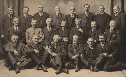 Keywords: group portraits groupportraits groupshot people monochrome Photographer: Reuben R. Sallows (1855 - 1937) Description: Posed portrait of twenty-one men wearing dark suits, white shirts and ties. Eight men stand in back row, seven are seated in middle, six men sit on floor with small black and white dog held on lap of man in centre. Curtains in background on left and right. Sallows imprint in lower left corner of matte. Object ID : 0472-rrs-ogohc-ph View additional photographs by Sallows that are held in other collections at the Reuben R. Sallows Digital Library. Order a higher-quality version of this item by contacting the Huron County Museum (fee applies). Photographer: Reuben R. Sallows (1855 - 1937) Description: Posed portrait of twenty-one men wearing dark suits, white shirts and ties. Eight men stand in back row, seven are seated in middle, six men sit on floor with small black and white dog held on lap of man in centre. Curtains in background on left and right. Sallows imprint in lower left corner of matte. Object ID : 0472-rrs-ogohc-ph View additional photographs by Sallows that are held in other collections at the Reuben R. Sallows Digital Library. Order a higher-quality version of this item by contacting the Huron County Museum (fee applies). |