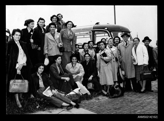 Keywords: icem international committee for european migration internationalcommitteeforeuropeanmigration bremen germany german migrants germanmigrants migrant migrants immigration post-war migration postwarmigration australia blackandwhite monochrome photo border people team sport sport black and white Group of young women [approximately 20] standing near bus, possibly in Bremen, Germany, with two men, apparently before migrating to Australia. Some of the women have a nametag on their left lapel. Inscriptions on the reverse read: `Photos sent by Schroder, Bremen', `such girls Bremen Australia 52' and `8/10/50.' A black ink stamp reads: `ICEM photograph no: 460'. (ICEM = Intergovernmental Committee for European Migration). The ANMM undertakes research and accepts public comments that enhance the information we hold about images in our collection. Object no. ANMS0214[102] The Australian National Maritime Museum will be holding an after-dark lightshow based on stories of migration from 26 January to 17 February 2013. Check the website for more information on 'Waves of Migration', and how you can tell share your migration story. Group of young women [approximately 20] standing near bus, possibly in Bremen, Germany, with two men, apparently before migrating to Australia. Some of the women have a nametag on their left lapel. Inscriptions on the reverse read: `Photos sent by Schroder, Bremen', `such girls Bremen Australia 52' and `8/10/50.' A black ink stamp reads: `ICEM photograph no: 460'. (ICEM = Intergovernmental Committee for European Migration). The ANMM undertakes research and accepts public comments that enhance the information we hold about images in our collection. Object no. ANMS0214[102] The Australian National Maritime Museum will be holding an after-dark lightshow based on stories of migration from 26 January to 17 February 2013. Check the website for more information on 'Waves of Migration', and how you can tell share your migration story.