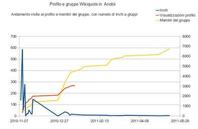 Keywords: Gruppo Wikiquote di aNobii, andamento membri.png it Grafico del numero di visualizzazioni del profilo e di iscritti al gruppo di Wikiquote in italiano in aNobii correlati al numero di inviti In ordinata a sinistra inviti e visualizzazioni totali a destra gli inviti di quel giorno Fino al 12 novembre 2010 sono incluse migliaia di inviti a gruppi diversi da quello su Wikiquote da parte dell'utenza Wikiquote mentre in seguito gli inviti sono stati inviati prevalentemente da un'altra utenza own Nemo bis 2011-02-24 Cc-zero Wikiquote statistics Wikimedia Italia |
