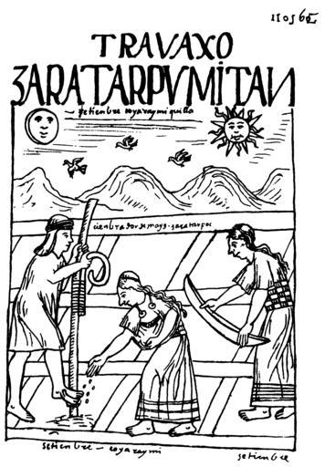 | Keywords: Guamán Poma 1615 1156 septiembre.png en p 1156 September ZARA TARPV MITAN Cycle of sowing maize see original and comments on http //www kb dk/permalink/2006/poma/1166/en/text/ open id2978806 Guaman Poma Website fr Septembre cycle des semailles du maïs es Septiembre el ciclo de sembrar maíz Guamán Poma de Ayala Felipe 1615 Nueva corónica y buen gobierno Peruvian manuscript Felipe Guamán Poma de Ayala 1615 PD-old-100-1923 Maize illustrations Felipe Guamán Poma de Ayala | ||||