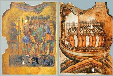 | Keywords: Guerande-vikings-1.jpg folio 7v s aubin défendant guérande folio 7r flotte normande Life of Saint Aubin / Miracula Sancti Albini / Vie de Saint Aubin created in the XIe - From abbaye de Angers France - BNF unknown - died before 1200 all - public domain 0 PD-old knots in art and decoration Guérande Normans Miracula Sancti Albini Viking ships in art Vikings in art |