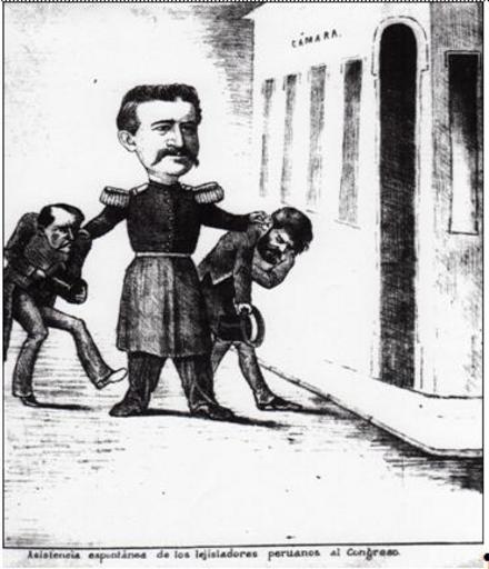 Keywords: Guerra del pacífico 1879-1884 Caricatura 80.jpg es Patricio Ibarra Cifuentes escribió Una vez en el poder Francisco García Calderón presidente provisional del Perú electo bajo la supervisión de las fuerzas de ocupación chilenas convocó la reunión de un Congreso con el objeto de retomar cierta normalidad en la vida cívica del Perú y de ese modo iniciar el camino hacia la obtención de la paz con Chile No obstante la división interna de la clase política peruana unos partidarios de García Calderón y otros del ex dictador Nicolás de Piérola significó la creación de dos congresos distintos en Chorrillos y Ayacucho respectivamente El primero de ellos tuvo graves problemas de quórum debido al poco interés demostrado por la causa de García Calderón asociada no sin razón a una suerte de servilismo hacia los intereses de los chilenos A propósito de la inasistencia de los congresistas esta caricatura publicada en El Padre Cobos el 2 de junio de 1881 muestra al general en jefe chileno Pedro Lagos llevando por las orejas a dos representantes a una sesión del cuerpo legislativo 1879-1884 http //www tesis uchile cl/tesis/uchile/2009/ibarra_pa/html/TH 4 html Chilean magazines El Ferrocarrilito El Padre Cobos El Diablo José Peluca El Barbero El Corvo Padre Padilla Diógenes other versions PD-old-70-1923 Chilean Caricatures in the War of the Pacific |