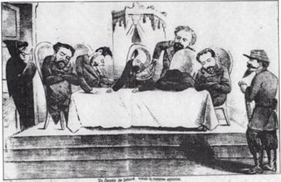 Keywords: Guerra del pacífico 1879-1884 Caricatura 8.jpg en Patricio Ibarra Cifuentes escribe Un consejo de gobierno viendo la cuestión argentina vio la luz el 4 de julio de 1881 Aquí El Padre Cobos acusa de negligencia a los gobernantes chilenos en el tratamiento de los problemas limítrofes con los vecinos orientales La imagen muestra al presidente Aníbal Pinto y a su consejo de ministros durmiendo profundamente mientras el mandatario argentino general Julio Roca le roba del bolsillo de su chaqueta un pañuelo donde se lee Patagonia Por otra parte el Padre Cobos a la derecha y un militar apoyado en su sable a la izquierda observan impávidos la escena Días más tarde de la publicación de este grabado el 23 del mismo mes de julio de 1881 y luego de años de controversia se firmó en Buenos Aires el tratado por el cual se fijó como límite entre Chile y Argentina la cordillera de los Andes siguiendo el principio de divortium aquarium en las más altas cumbre De ese modo presionado por la posibilidad de la entrada a la guerra de Argentina la administración Pinto cedió de manera definitiva la Patagonia y parte de la Tierra del Fuego a la Argentina quedando en posesión definitiva del Estrecho de Magallanes 1881 http //www tesis uchile cl/tesis/uchile/2009/ibarra_pa/html/index-frames html Caricaturas chilenas de la Guerra del Pacífico 1879-1884 La presente monografía presenta un análisis e interpretación de 105 caricaturas publicadas en periódicos humorísticos chilenos inspiradas en las causas desarrollo y consecuencias de la Guerra del Pacífico enfrentamiento armado que Chile llevó adelante contra la alianza formada por Perú y Bolivia durante los años 1879 y 1884 Divididos en seis categorías temáticas los grabados seleccionados muestran como los editores de los rotativos y sus dibujantes señalaron su particular punto de vista aportando con ello a la discusión pública emanada desde la prensa a propósito del conflicto del norte Asimismo se presenta un sucinto estudio de los diarios de sátira que vieron la luz mientras se llevaban a cabo las hostilidades caracterizándolos y ubicándolos a partir de la posición que ocuparon en el espectro político de la época http //www tesis uchile cl/tesis/uchile/2009/ibarra_pa/html/index-frames html http //www repositorio uchile cl/handle/2250/108555 Compiladas por Ibarra Cifuentes Patricio other versions PD-Art Chilean Caricatures in the War of the Pacific |