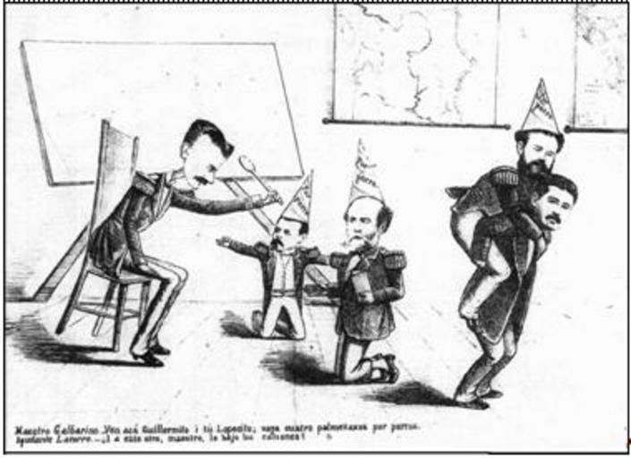 Keywords: Guerra del pacífico 1879-1884 Caricatura 19.jpg en Patricio Ibarra Cifuentes escribe Esta sátira de El Barbero del 1º de noviembre de 1879 muestra al jefe de la escuadra comandante Galvarino Riveros como un profesor que reprende al almirante Juan Williams Rebolledo y al capitán Juan Esteban López por su mal desempeño cuando ellos estuvieron a cargo de la flota chilena Por su parte Juan José Latorre comandante del blindado Cochrane en el rol de ayudante de Riveros lleva en sus hombros al presidente del Perú Mariano Ignacio Prado y pregunta si es menester castigarlo también 1881 http //www tesis uchile cl/tesis/uchile/2009/ibarra_pa/html/index-frames html Caricaturas chilenas de la Guerra del Pacífico 1879-1884 La presente monografía presenta un análisis e interpretación de 105 caricaturas publicadas en periódicos humorísticos chilenos inspiradas en las causas desarrollo y consecuencias de la Guerra del Pacífico enfrentamiento armado que Chile llevó adelante contra la alianza formada por Perú y Bolivia durante los años 1879 y 1884 Divididos en seis categorías temáticas los grabados seleccionados muestran como los editores de los rotativos y sus dibujantes señalaron su particular punto de vista aportando con ello a la discusión pública emanada desde la prensa a propósito del conflicto del norte Asimismo se presenta un sucinto estudio de los diarios de sátira que vieron la luz mientras se llevaban a cabo las hostilidades caracterizándolos y ubicándolos a partir de la posición que ocuparon en el espectro político de la época http //www tesis uchile cl/tesis/uchile/2009/ibarra_pa/html/index-frames html http //www repositorio uchile cl/handle/2250/108555 Compiladas por Ibarra Cifuentes Patricio other versions PD-Art Chilean Caricatures in the War of the Pacific |