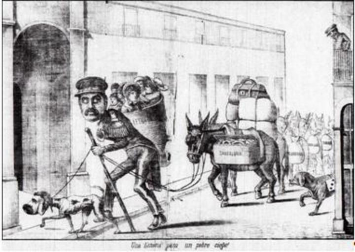 Keywords: Guerra del pacífico 1879-1884 Caricatura 88.jpg es Patricio Ibarra Cifuentes escribió Una limosna para un pobre ciego pide irónicamente el periódico José Peluca en esta caricatura del 10 de mayo de1884 El general en jefe de la ocupación de Lima Patricio Lynch con los ojos cerrados y apoyándose en un báculo es conducido por un perro-guía caracterizado como el presidente Domingo Santa María Lynch en su espalda porta un saco lleno de mujeres denominado como efectos refiriéndose a las múltiples damas limeñas encantadas con el trato dado por el militar chileno Asimismo conduce una recua de mulas donde transporta toda la chafalonía especies y el dinero recaudado por los numerosos cupos de guerra impuestos durante toda la guerra José Peluca el personaje homónimo del periódico observa la escena desde un balcón 1879-1884 http //www tesis uchile cl/tesis/uchile/2009/ibarra_pa/html/TH 4 html Chilean magazines El Ferrocarrilito El Padre Cobos El Diablo José Peluca El Barbero El Corvo Padre Padilla Diógenes other versions PD-old-70-1923 Chilean Caricatures in the War of the Pacific |