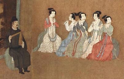 Keywords: GuHongzhongNightRevels2-closeup.jpg after Gu Hongzhong Night Revels of Han Xizai century 12 original century 10 hanging scroll ink colors silk cm 28 7 335 Institution Palace Museum Beijing accession number object history credit line The man on the left believed to be Li Chia-ming the Deputy Court Music Director is playing a paiban clapper made from several slats of wood and the women are playing three guan oboes and two dizi transverse flutes http //depts washington edu/chinaciv/painting/4literat htm hanxizai using Zhongguo lidai huihua Gugong bowuyuan canghua ji vol 1 Beijing Renmin meishu chubanshe 1978 p 89 PD-old-100 Art of the Five Dynasties and Ten Kingdoms Paintings of the Song Dynasty 12th-century paintings Night Revels Guan instrument Dizi Paiban Percussion instruments in art Hanfu Chairs in art |