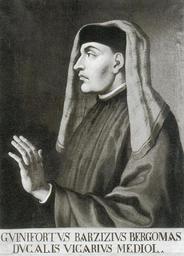 Keywords: Guiniforte-barzizza-vincenzo-orelli-1783.jpg Guiniforte Barzizza Pavia 1406 - Milan 1463 Italian humanist scholar and teacher of Galeazzo Maria and Ippolita Maria Sforza This is one of a series of portraits by Vincenzo Angelo Orelli in honor of famous figures of Bergamo These included Gasparino and Guiniforte Barzizza Gregorio Barbarigo Giuseppe Celestino Astori and Pierantonio Serassi The portrait was based on an engraving Oil on canvas 81x57 5cm Enciclopedia delle Famiglie Lombarde http //servizi ct2 it/ssl/wiki/index php title File Barzizza_Guiniforte jpg Vincenzo Angelo Orelli 1783 PD-old-100 PD-1996 <gallery> File Guiniforte-barzizza-1664 png 1664 Engraving File Barzizza-guiniforte-salvioni-anton-fritz-1723 jpg 1723 Reversed Copy File Barzizza-guiniforte-anton-fritz-1723-detail jpg 1723 Cropped</gallery> 18th-century portrait paintings in Italy Vincenzo Angelo Orelli Humanists from Italy Galeazzo Maria Sforza Ippolita Maria Sforza |