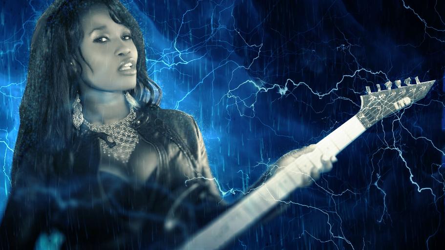 | Keywords: guitar music singer entertainment girl star instrument pop band performer musician performance electric guitarist rock artist musical celebrity woman player attractive black african american lifestyle female digital processing lightnings blue background digital creation |