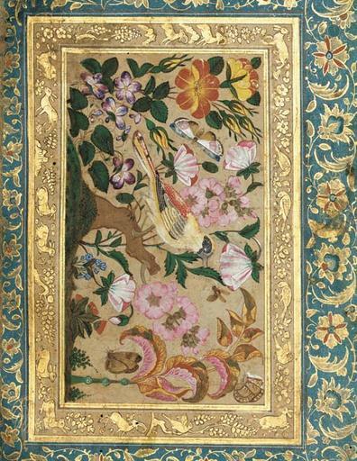 Keywords: Gul-o-Bulbul-17thC.jpg en From the Manley album the recto gouache heightened with gold on paper a goldfinch seated on the branch of a rosebush with other brightly coloured plants and butterflies around it mounted on card with a border of birds and deer in gold outer blue margin with spiralling floral meander further information see source 2003-09-19 14 18 45 http //www christies com/lotFinder/lot_details aspx intObjectID 4160831 Possibly by Bahram Sofrakesh PD-old-100 Uploaded with UploadWizard Birds in Persian art Roses in applied arts Carduelis carduelis in art |