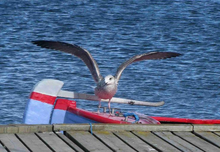 Keywords: gull bird waterfowl water nature fly sea wing lake animal blue sky summer beach bank coast fish port booked pier black and white