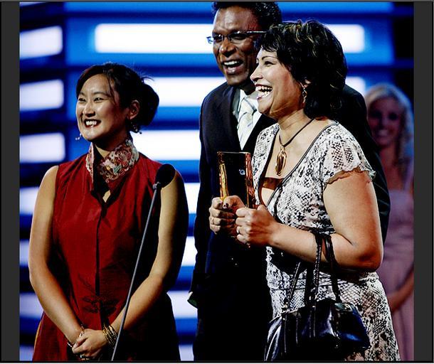 Keywords: Gullruten 2007.PNG Migrapolis som vinner gullruten for beste magasin- og livsstilsprogram Own 11 05 07 Withuran Rajan Chelliah Group photographs People facing left Group portraits with 3 persons