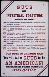 Keywords: Guts or intestinal fortitude. Our boys in uniform can^ Yes - it takes guts to be an American^ Remember Pearl Harbor. - NARA - 535231.tif Scope and content General notes 535231 Local identifier 179-WP-1381 Office for Emergency Management War Production Board 01/1942 - 11/03/1945 Still Picture Records Section Special Media Archives Services Division NWCS-S National Archives at College Park 8601 Adelphi Road College Park MD 20740-6001 other date circa 1942 1943 Record group Record Group 179 Records of the War Production Board 1918 - 1947 Record group ARC 508 War Production Board compiled 1942 - 1943 Series ARC 533858 File unit File unit ARC Variant control numbers NAIL Control Number NWDNS-179-WP-1381 yes Other versions <gallery> File Guts_or_intestinal_fortitude _Our_boys_in_uniform_can _Yes_-_it_takes_guts_to_be_an_American _Remember_Pearl_Harbor _-_NARA_-_535231 tif tif File Guts_or_intestinal_fortitude _Our_boys_in_uniform_can _Yes_-_it_takes_guts_to_be_an_American _Remember_Pearl_Harbor _-_NARA_-_535231 jpg jpg </gallery> NARA-cooperation PD-USGov World War II posters from the United States NARA TIF images with categorized JPGs |