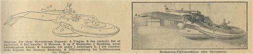 | Keywords: Gyrocopter by Papin and Rouilly 1914.jpg Plan of Gyropter invented by Papin and Rouilly from France from Danish magazine Illustreret Familiejournal Illustrated Familyjournal 1914 no 44 p 29 The caption reads Diagram showing the parts of the gyropter A The wing B The central part of the machine C Airchannels D The motor E F The oiltank J The gondola wherein the aircaptain sits K The antenna that ends in the opening L I the lenseshaped body that creates a cushion G Emitteropening for the airstream from the wing The caption on the second picture reads The boomerang flying machine or the gyropter Illustreret Familiejournal 1914 Users reproduction of an expired work of art PD-Art Monocopter 1910s diagrams Inventions Hovercraft in art |