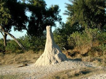 Keywords: H17termound.jpg An almost 3 m high termite mound in Botswana Original caption <br />You'd expect the Webmaster of Fourmilab to have a thing about ants but I also rejoiced to encounter the next best thing--termites--upon arriving in Botswana These are serious termites not the tiddlers that munch on the lumber of your house This termite mound is almost three metres in height Termites build them with an intricate ventilation system which maintains a close to constant temperature inside--human architects have recently applied this insect-developed technology to office buildings <p>Termite mounds are often found adjacent to trees there was a huge one next to the tree which shaded our tent at Vumbura Camp They are often the first step in the local ecosystem succession; the termite mound raises soil from the low-lying and frequently flooded river delta which is then colonised by small plants and eventually trees This is a relatively new mound adjacent to a largely flooded area Termites stay within the mound during the winter season; they are active only during the hot summer months Ein fast drei Meter hoher Termitenhügel in Botsuana http //www fourmilab ch/images/eclipse_2001/africaimages html John Walker PD images from John Walker John Walker Insects of Botswana Termite mounds |