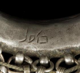 Keywords: H Kasil - Bracelet - Walters 572319 - Mark A.jpg The chased bracelet is made of a larger 2/3 and a smaller piece 1/3 that together form a hollow ring The design depicts four-leaf clovers six on the larger piece and three on the smaller piece of the ring The lower rim has twenty-two loops each with a ring and a drop-shaped pendant One pendant is missing This bracelet and Walters 57 2318 are a pair and may have been produced in the same workshop On the inner side of the bracelet is an Arabic stamp with the name of the ruler al-Mahdi The similarity to stamps of al-Mahdi al- Abbas makes it likely that the pendants were produced under his reign from AH 1161 to 1189 AD 1748-1775 In addition a Hebrew inscription is engraved with the name of the silversmith Kasil 1161-1189 AH/AD 1748-1775 silver with gilding Outer diam cm 6 5 ; Inner diam 1 13/16 x W 9/16 in 4 6 x 1 4 cm accession number 57 2319 80923 Mr Benjamin Zucker Zucker Family Trust and Mr Derek Content New York and London by purchase Walters Art Museum Joint gift to the Walters Art Museum Baltimore and the Israel Museum Jerusalem by Mr Benjamin Zucker and Mr Derek Content in honor of Mrs Barbara Zucker and Mrs Amanda Content 2010 Stamp Arabic al-Mahdi Engraving Hebrew Kasil place of origin northern Yemen Walters Art Museum license Jewellery in the Walters Art Museum South Arabian art in the Walters Art Museum H Kasil Media contributed by the Walters Art Museum needs category review Media contributed by the Walters Art Museum needs artist update |