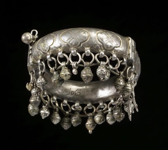Keywords: H Kasil - Bracelet - Walters 572319 - View A.jpg The chased bracelet is made of a larger 2/3 and a smaller piece 1/3 that together form a hollow ring The design depicts four-leaf clovers six on the larger piece and three on the smaller piece of the ring The lower rim has twenty-two loops each with a ring and a drop-shaped pendant One pendant is missing This bracelet and Walters 57 2318 are a pair and may have been produced in the same workshop On the inner side of the bracelet is an Arabic stamp with the name of the ruler al-Mahdi The similarity to stamps of al-Mahdi al- Abbas makes it likely that the pendants were produced under his reign from AH 1161 to 1189 AD 1748-1775 In addition a Hebrew inscription is engraved with the name of the silversmith Kasil 1161-1189 AH/AD 1748-1775 silver with gilding Outer diam cm 6 5 ; Inner diam 1 13/16 x W 9/16 in 4 6 x 1 4 cm accession number 57 2319 80923 Mr Benjamin Zucker Zucker Family Trust and Mr Derek Content New York and London by purchase Walters Art Museum Joint gift to the Walters Art Museum Baltimore and the Israel Museum Jerusalem by Mr Benjamin Zucker and Mr Derek Content in honor of Mrs Barbara Zucker and Mrs Amanda Content 2010 Stamp Arabic al-Mahdi Engraving Hebrew Kasil place of origin northern Yemen Walters Art Museum license Jewellery in the Walters Art Museum South Arabian art in the Walters Art Museum H Kasil Media contributed by the Walters Art Museum needs category review Media contributed by the Walters Art Museum needs artist update |