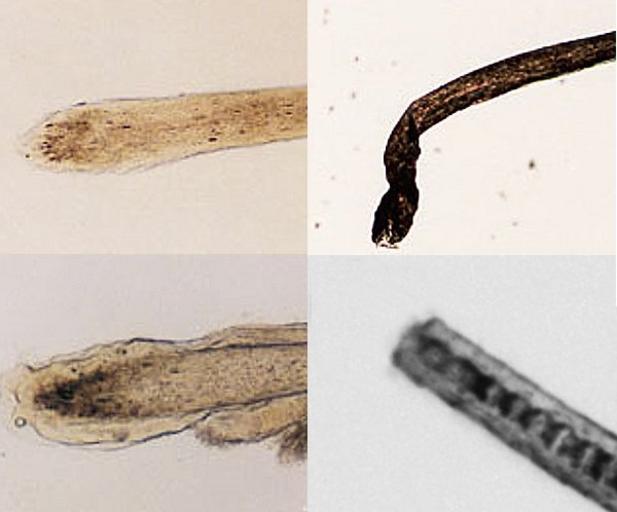 Keywords: Haarwurzeln im Vergleich.jpg Montage dreier Bilder telogene oben anagene mitte katagene unten Haarwurzel source http //www fbi gov/hq/lab/fsc/backissu/jan2004/research/2004_01_research01b htmsource As a publication of the U S Government Forensic Science Communications is not copyrighted PD-USGov Anatomy of human hair Forensic science Montages of animals microscopic images of human hair