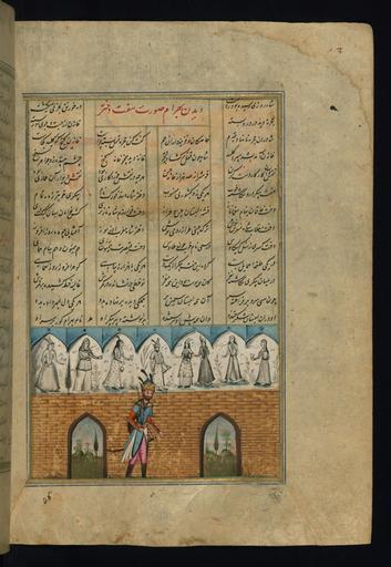 Keywords: Habib Allah ibn 'Ali ibn Husam - Bahram Gur and Portraits of the 7 Princesses - Walters W608174B - Full Page.jpg Bahram Gur is depicted on this folio from Walters manuscript W 608 with his own portrait and portraits of the 7princesses inscribed as follows Azar Suz Nasrin Nush Naz Pari Na'ma Naz Furak Daraspi and Hamay 13th century AH/AD 19th century Safavid; Qajar ink pigments laid paper cm 24 17 accession number W 608 174B 83043 Baqi Pasha date and mode of acquisition unknown ownership note fol 1a 'Ali Riza ibn Mustafá 1180 AH/AD 1766-1777 mode of acquisition unknown ownership note with seal fol 2a 'Ali Mawla 'Ali date and mode of acquisition unknown seal impression fols 153a 177a 233a 351a Sahibi umm mother of Mirza Ibrahim date and mode of acquisition unknown ownership note fol 351b Shah Vardi Ghulam Shah Mardan date and mode of acquisition unknown seal impression fol 349 Henry Walters Baltimore date and mode of acquisition unknown Walters Art Museum Henry Walters Acquired by Henry Walters place of origin Iran Walters Art Museum license 2D Khamsa of Nizami Safavid Walters MS 608 Media contributed by the Walters Art Museum needs category review Seven beauties |