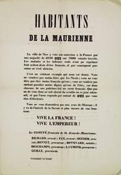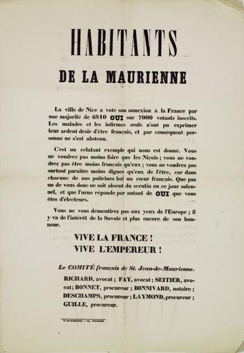 Keywords: HabitantsdelaMaurienne1860.jpg fr Discours du comité français de Saint-Jean-de-Maurienne avant le vote pour l'annexion Saint-Jean-de-Maurienne 1860 «Cette affiche provient des archives départementales de la Savoie et du site Internet de Conseil général de la Savoie http //www savoie fr/archives73/expo_affiches_1814-1860/ Habitants de la Maurienne - Savoie Saint-Jean-de Maurienne imprimerie Vulliermet 1860 1860 PD-old PD-old Poster of Savoie |