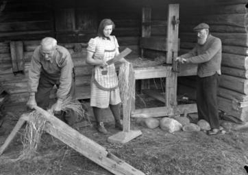 Keywords: håndverk jordbruk kultur kulturminner landbruk mennesker museer verktøy og redskaper verktøyogredskaper oppland norge nor blackandwhite monochrome black and white En kvinne og to menn arbeider med lin foran en linbadstu. Opprinnelig var denne badstuen fra gården Dile i Vestre Gran. En kvinne og to menn arbeider med lin foran en linbadstu. Opprinnelig var denne badstuen fra gården Dile i Vestre Gran. |