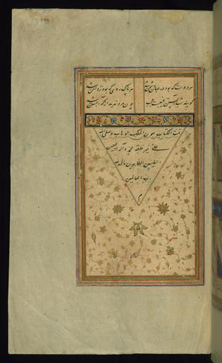 Keywords: Hafiz - Illuminated Tailpiece and Colophon - Walters W634199A - Full Page.jpg This illuminated tailpiece from Walters manuscript W 634 contains the final verses of the Divan and a colophon with prayers for the prophet Muhammad and his family 10th century AH/AD 16th century Safavid ink pigments laid paper cm 23 5 14 5 accession number W 634 199A 81410 Henry Walters Baltimore date and mode of acquisition unknown Walters Art Museum Henry Walters Acquired by Henry Walters Transliteration place of origin Iran Walters Art Museum license 2D Divan by Hafez Safavid Walters MS 634 |