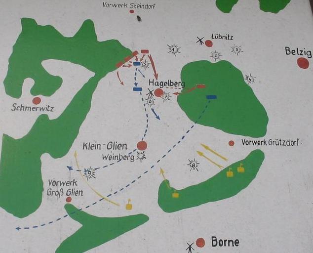 | Keywords: Hagelberg D2 Battle.JPG Karte der Schlacht bei Hagelberg 1813 Das Dorf Hagelberg ist ein Ortsteil der Kreisstadt Belzig im Landkreis Potsdam-Mittelmark und liegt im Naturpark Hoher Fläming Zwei Denkmäler erinnern an die Schlacht von 1813 in den Befreiungskriegen Preußens gegen Frankreich Map of the Battle nearby Hagelberg 1813 The village Hagelberg is a part of the town Belzig in the district Postdam Mittelmark state Brandenburg Germany The village appertains to the nature park Naturpark Hoher Fläming There are two monuments commemorating to the prussian victory in the žBattle nearby Hagelberg in 1813 against Napoleon Foto Ausschnitt einer offiziellen Informationstafel der Natuparkverwaltung Hoher Fläming auf dem Gipfel des Hagelbergs Angaben zur Karte Urheber Datum werden nicht gemacht 12 October 2006 Date of the picture Lienhard Schulz taken the picture Public Domain wegen de Panoramafreiheit Lienhard Schulz Battle of Hagelberg |