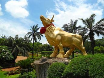 Keywords: haikou city china sky clouds golden bull statue monument palms palm trees summer spring plants park garden nature outside