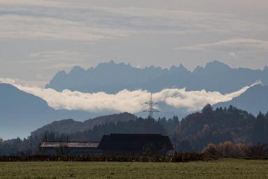 Keywords: hair dryer landscape mountains alpine upper bavaria autumn trees blue grey haze distant view sky nature forest clouds föhn clouds barn transmission mast mast electric pole arable