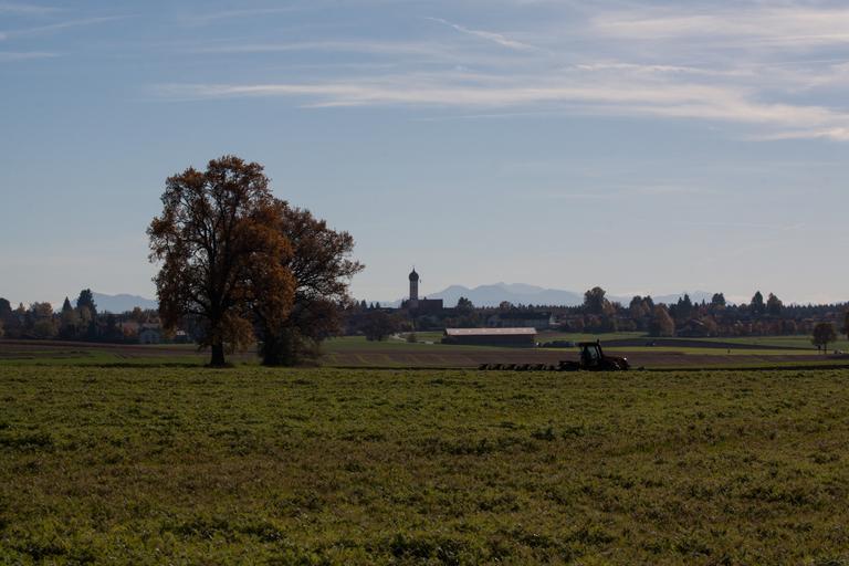 Keywords: hair dryer village landscape mountains alpine upper bavaria autumn trees blue green yellow orange distant view clouds sky nature tractor plow meadow