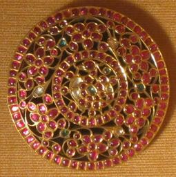 Keywords: Hair ornament, Tamil Nadu, India, 19th century, gold, rubies, emeralds, and clear stones, Honolulu Academy of Arts.JPG en Hair ornament Tamil Nadu India 19th century gold rubies emeralds and clear stones Honolulu Academy of Arts own Hiart photo 2011 Art of India in the Honolulu Museum of Art Gold jewellery of India Hair ornaments Jewellery of Tamil Nadu Ornaments in Tamil Nadu Cc-zero |