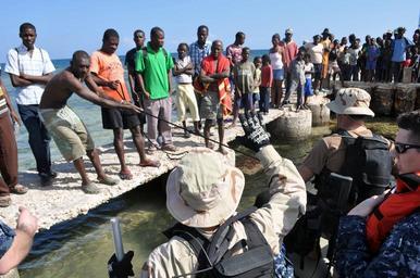 | Keywords: Haiti relief 100124-N-GY309-001.jpg en Members of a USS Normandy CG 60 shore party team prepare to moor their rigid hull inflatable boat RHIB to a small dock in the small Haitian town of Petit Trou de Nippes about 70 miles from Port-au-Prince along the southeastern coast Normandy accessed damage and established ties with local leadership there in order to prepare for possible follow-on humanitarian assistance/disaster relief HA/DR operations for that village During the ship s initial visit Normandy delivered crucial medical supplies provided gas for the town s generator and coordinated a medical evacuation for an 11-year-old girl that was diagnosed by the ship's independent duty corpsman as having yellow fever Normandy's efforts are part of Operation Unified Response the humanitarian assistance/disaster relief response to earthquake that occurred in Haiti on Jan 12 U S Navy Photo by Ensign Adam R Cole/Released 2010-01-23 Lt Adam Cole https //www dvidshub net/image/1323649 100124-N-GY309-001 2014-05-08 08 05 HT PD-USGov-Military-Navy USS Normandy CG-60 Operation Unified Response Images from DoD uploaded by Fæ |