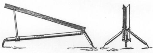 | Keywords: Hale rocket launcher1.jpg en Launcher for 9-pdr and 24-pdr Hale rockets from 1868 Both are similar but with other dimensions They Consists of a sheet iron V trough the sides made at an angle of 80° with each other supported at rear by threelegs made of wrought iron tubing two short ones opening right and left and one long one to the front beneath the trough each terminating in a prong On the front one runs a gun-metal ring connected by two bars with a V near the front of the trough the ars pivot on V and ring; the elevation is given by slipping the ring up and down the front leg and clamping it with the arrow on the rear edge of the ring at the requiered line of graduation up to 15° for 9-pdr and 25° for 24-pdr with reference to the plane on which the machine stands At the back end of the trough is an iron stop preventing the rocket sliding back; it is slotted to form a crutch for copper friction tubes Dimensions 9-pr Weight 27lbs Length of trough 3' 5 Width of sides 2 5 24-pr Weight 64 75lbs Length of trough 5' 6 Width of sides 4 Treatise on ammunition Eds 1 2 4 2 eds 5-8 1874 Page 233http //www europeana eu/portal/record/9200143/BibliographicResource_2000069496280 html War Office 1874 PD-old Hale rocket |