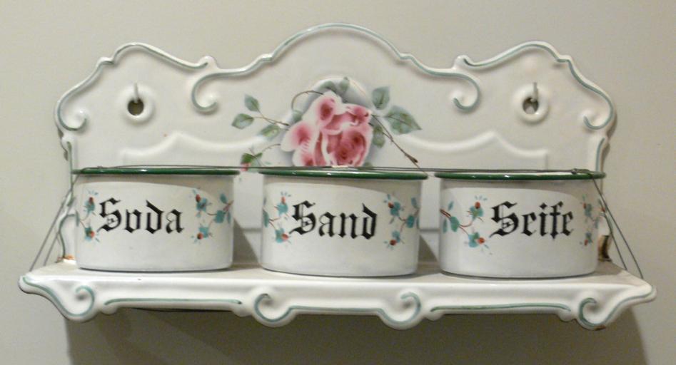 Keywords: Halter für Soda Sand Seife.jpg Halter für Soda Sand und Seife emailliertes Eisenblech 1 Hälfte 20 Jh <br />Landesmuseum Württemberg Außenstelle Museum für Volkskultur in Württemberg Waldenbuch ; E 7 2 Inv Nr 1988/577 own 2007-07 Photo Andreas Praefcke Own work all rights released Public domain Museum der Alltagskultur Waldenbuch Storage racks Natron Sand Soap Soap dishes Kitchen utensils Enamel Cleaning equipment |