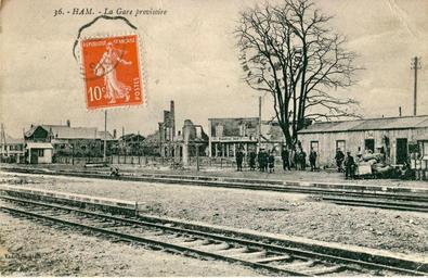 Keywords: HAM - La gare provisoire.JPG Carte postale ancienne éditée par Vassel<br >Gare de Ham Somme la gare provisoire après les combats de la Première guerre mondiale alte Postkarte aus der Edition Vassel<br >Bahnhof von Ham Somne vor den Kämpfen im 1 Weltkrieg Collection personnelle carte oblitérée en 1925 Scanné par Claude Shoshany pd-old DEFAULTSORT Ham Somme Gare de Ham Somme Battle of the Somme Postcards of Somme |