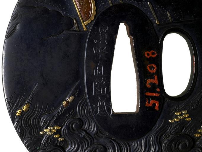 | Keywords: Hamano Naoyuki - Tsuba with a Kuanyu Preparing to Throw a Spear - Walters 51208 - Mark.jpg The mounted figure along the right edge of this tsuba is 2nd century Chinese general Kanyu Ch Guan Yu Kuan Yu Stories of his activities during the Three Kingdoms period are told in the 14th century novel Romance of the Three Kingdoms Kuanyu is about to plunge his spear into the water Waves fill the lower section of both sides of the tsuba On the reverse the spears and battle flag of a army appear above the waves between 1773 1829 late Edo shakudo details in gold cm 7 2 6 7 0 35 accession number 51 208 11048 Henry Walters Baltimore date and mode of acquisition unknown Walters Art Museum Henry Walters Acquired by Henry Walters Signature Hamano Naoyuki place of origin Edo present-day Tokyo Japan Walters Art Museum license Tsuba in the Walters Art Museum Hamano Naoyuki Media contributed by the Walters Art Museum needs category review |