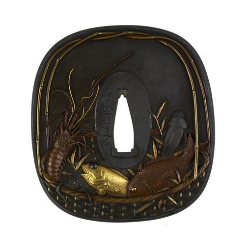 | Keywords: Hamano Noriyuki II - Tsuba with Basket of Fresh Seafood - Walters 51128.jpg On the front of this tsuba is a basket of sea food including a spiny lobster and a sea bream Both of these fish are considered celebratory and often eaten as part of New Year celebrations The basket also contains a squid and two additional fish On the back of the tsuba are mushrooms a daikon radish a turnip and a sprig of flowers between 1755 1787 Edo shibuichi gold and copper at bottom of nakago-ana cm 8 5 7 8 ; cm 0 46 d ; width at top of nakago-ana cm 7 4 accession number 51 128 15261 Henry Walters Baltimore date and mode of acquisition unknown Walters Art Museum Henry Walters Acquired by Henry Walters Signature Hamano Noriyuki place of origin Edo present-day Tokyo Japan Walters Art Museum license Tsuba in the Walters Art Museum Hamano Noriyuki II Media contributed by the Walters Art Museum needs category review |