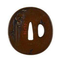 Keywords: Hamano Shôzui - Tsuba with the Taoist Immortal Bukan and his Tiger - Walters 51296 - Back.jpg The Taoist immortal Bukan Ch Fenggan Feng Kan was known for riding his tiger around his monastery to shock others Here he is shown atop his tiger at the right side of the tsuba Only the front of the tiger and Bukan's torso can be seen Bukan's ability to tame the tiger represents the power of his knowledge On the reverse is a waterfall between 1696 1769 Edo copper alloy shibuichi gold copper shakudo cm 7 1 6 6 0 56 accession number 51 296 16425 Henry Walters Baltimore date and mode of acquisition unknown Walters Art Museum Henry Walters Acquired by Henry Walters Signature Otsuryûken place of origin Edo present-day Tokyo Japan Walters Art Museum license Tsuba in the Walters Art Museum Hamano Shôzui Media contributed by the Walters Art Museum needs category review |