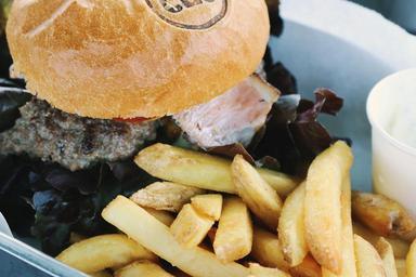 Keywords: hamburger bun fries food lunch dinner