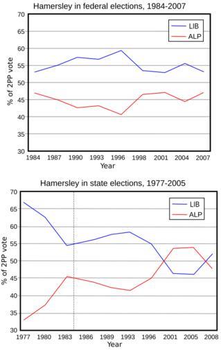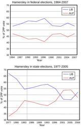 Keywords: Hamersley politics 2pp.svg A graph of two-party-preferred ALP-LIB results in state elections in Hamersley 1977-2008 and equivalent federal results 1984-2007 Own work based on figures published by Western Australian Electoral Commission and its federal counterpart held at Battye Library Perth Results from 1993 onwards combine results from East Hamersley and Glendale booths while earlier ones are solely Glendale 2008-12-13 Orderinchaos Originally made 19 February 2007 As federal results prior to 1984 are not available at polling place level a dotted line on the state graph indicates the point from which state and federal results can be compared Graphics by Orderinchaos78 Hamersley Western Australia |