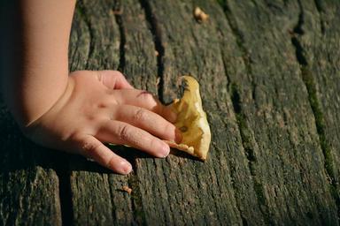 Keywords: hand child's hand access leaf autumn wood plank wood feel wooden structure close finger experience nature nature